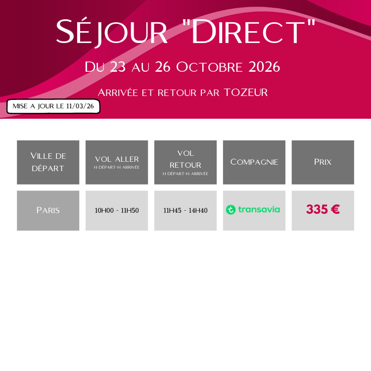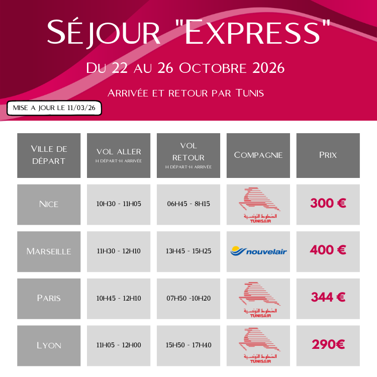 Les séjours « Express » et « Direct Paris-Tozeur » sont proposés hors vols. Notre aventure ensemble commence dès votre arrivée à l’aéroport (Tunis ou Tozeur, selon votre programme) et se termine au même endroit.