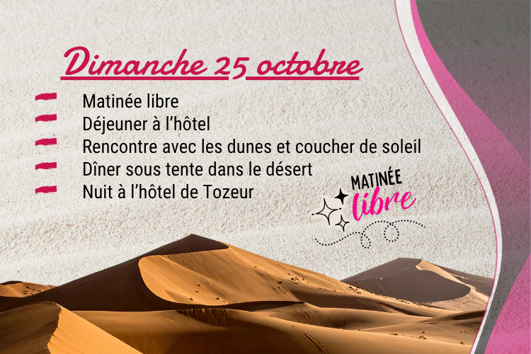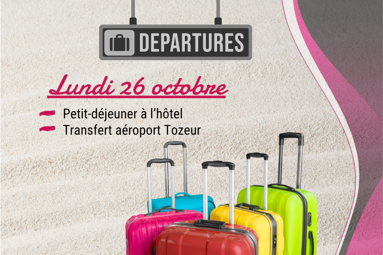 📌 Hébergement : 3 nuits en hôtel de catégorie supérieure (Tozeur) sur la base d’une chambre double.