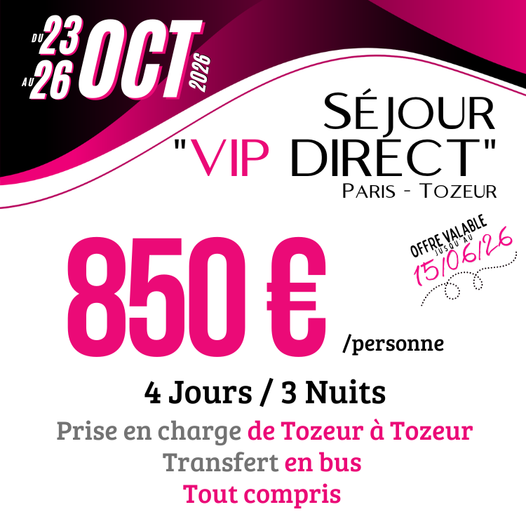 Le séjour Direct VIP a été conçu pour ceux qui exigent l’excellence, tant dans la logistique que dans l’émotion. En plus de la rapidité du vol direct Paris-Tozeur, cette formule transforme votre récupération en un moment de pur prestige.
